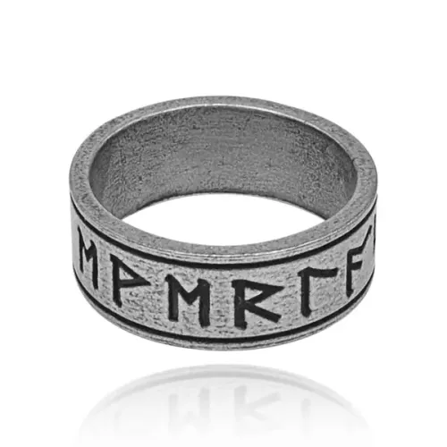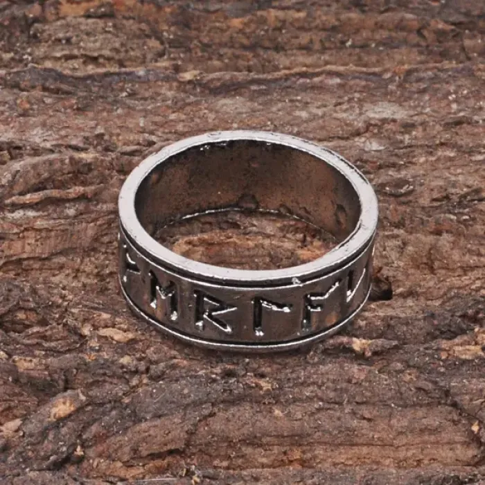 Руническое кольцо из металла с серебряным покрытием и скандинавским дизайном.