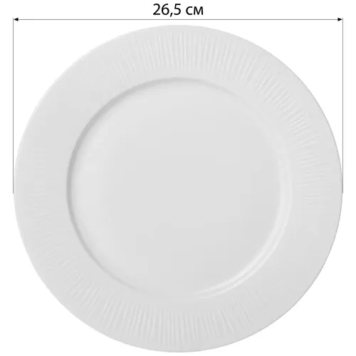 Тарелки выполнены из фарфора, обожжённого при высоких температурах, что повышает их термостойкость и устойчивость к царапинам. Белая глазурованная поверхность обладает гигиеничными свойствами и легко очищается. Конструктивно изделие имеет классическую форму с рельефным декором в виде радиальных линий.