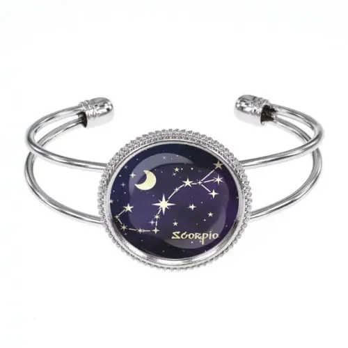 Браслет Знаки Зодиака - Скорпион представляет собой стильный аксессуар, который не только дополняет образ, но и символизирует силу и страсть знака Скорпиона. Изготовленный из бижутерного сплава с покрытием под серебро и стекла, этот браслет станет отличным подарком для ценителей астрологии.