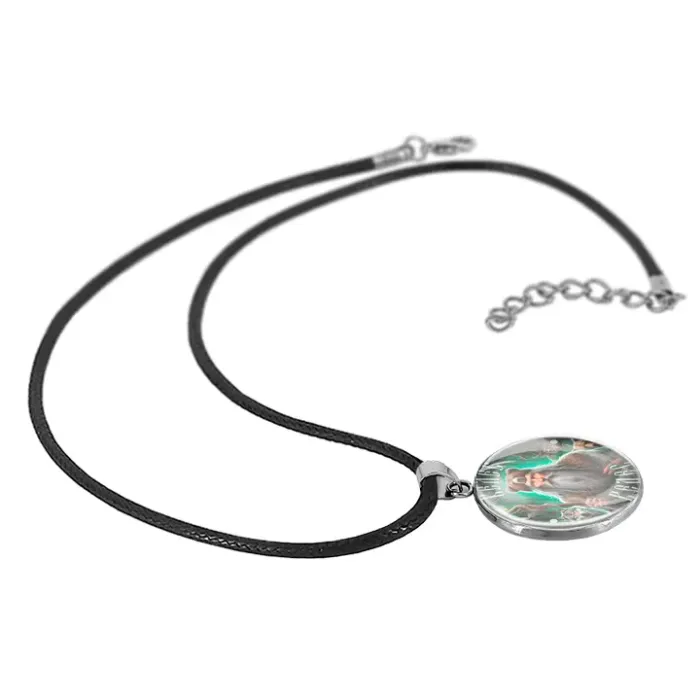 Амулет из нержавеющей стали с изображением под выпуклой стеклянной линзой.