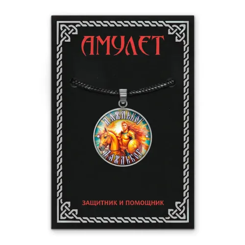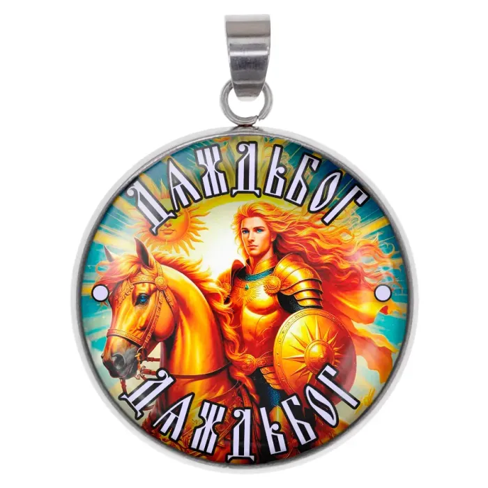 Амулет из нержавеющей стали с изображением славянского бога Даждьбога. Кулон защищён выпуклой стеклянной линзой.