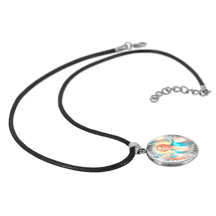 Амулет из нержавеющей стали с изображением под выпуклой стеклянной линзой.