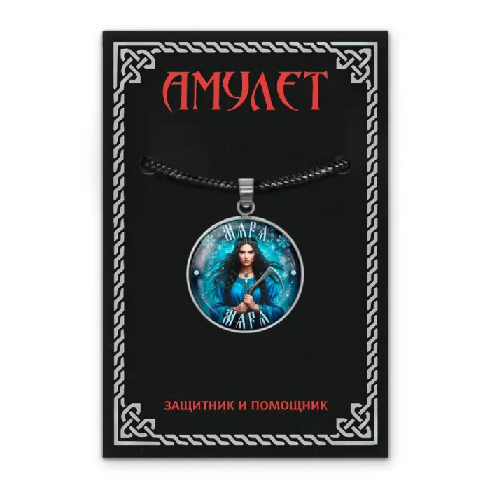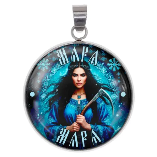 Амулет из нержавеющей стали с изображением богини Мары под выпуклой стеклянной линзой.
