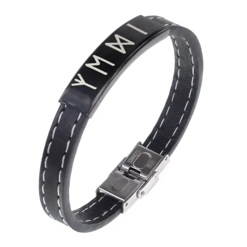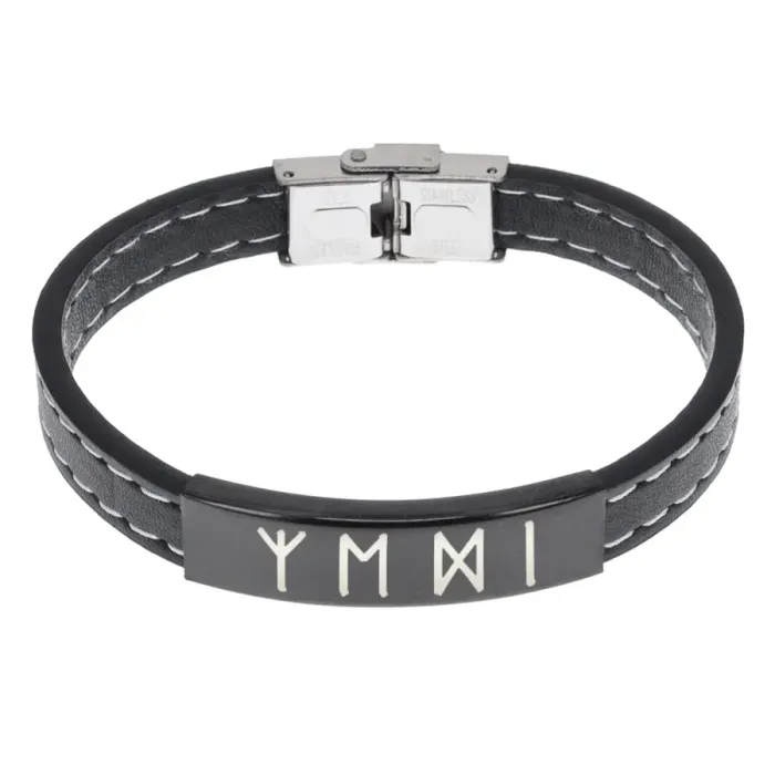 Кожаный браслет с руническим узором и элементами из нержавеющей стали.