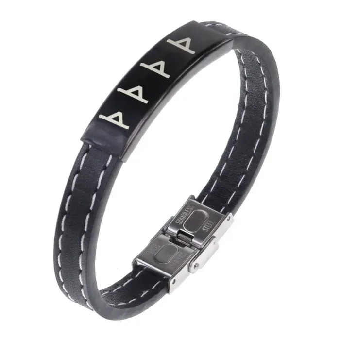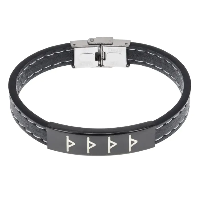 Кожаный рунический браслет с элементами из нержавеющей стали и символикой рун Турисаз.