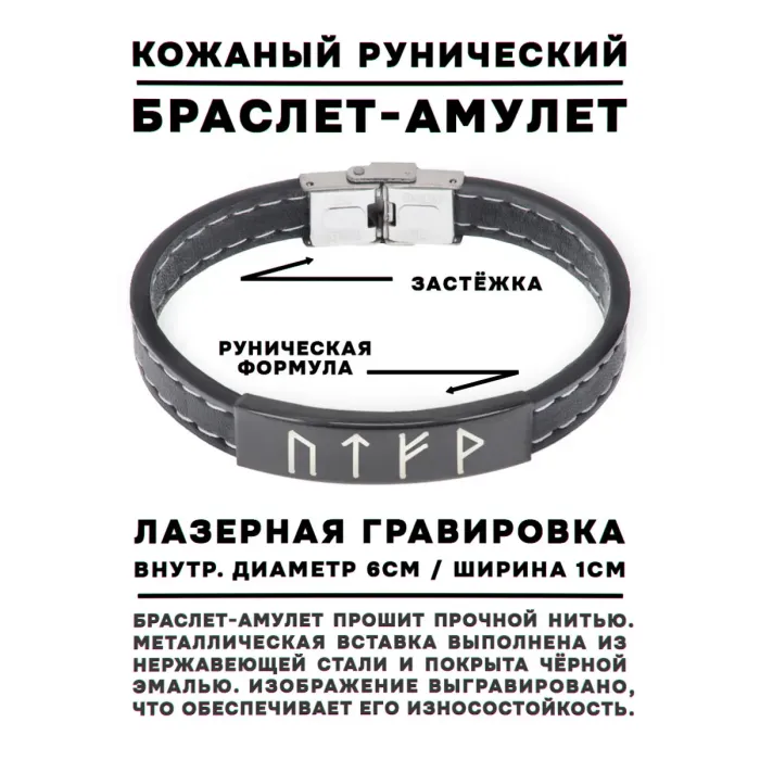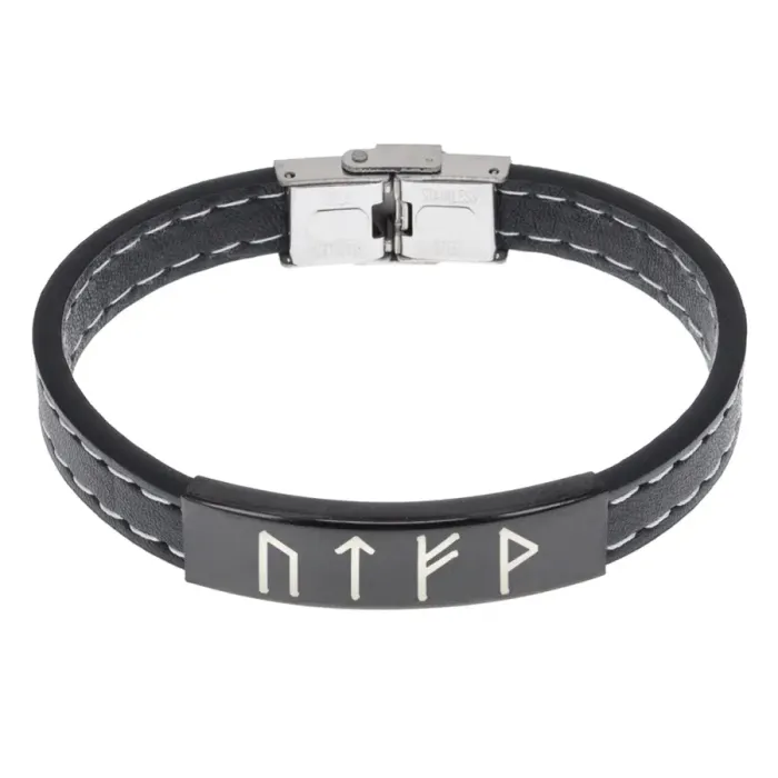 Кожаный рунический браслет с символикой для карьерного роста. Включает руны Уруз, Тейваз, Феху и Вуньо.