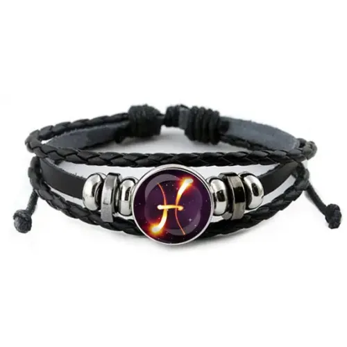 Кожаный браслет с изображением знака зодиака Рыбы станет стильным аксессуаром и символом индивидуальности. Этот уникальный предмет украшен диаметрально 20 мм изображением под выпуклой стеклянной линзой, что придает ему особую привлекательность.