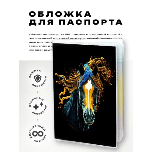 Обложка для паспорта из прозрачного ПВХ пластика с изображением лошади — символа силы и свободы. Этот стильный аксессуар не только защищает паспорт от повреждений, но и добавляет индивидуальности. Обложка упакована в удобный полипропиленовый пакет с вырубкой под еврокрючок, что делает её идеальным вариантом для подарка или личного использования. Прозрачный материал позволяет легко видеть содержимое, а яркая полиграфическая вставка привлекает внимание и подчеркивает уникальность стиля.