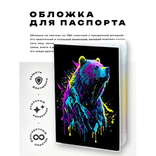Обложка для паспорта из прозрачного ПВХ пластика — это стильный и практичный аксессуар, который не только защищает документ, но и придаёт ему оригинальный вид. Полиграфическая вставка с изображением медведя добавляет уникальности и символизирует силу и уверенность. Обложка упакована в полипропиленовый пакет с вырубкой под еврокрючок, что делает её удобной для хранения и продажи. Этот товар станет отличным подарком или сувениром для любителей природы и животных.