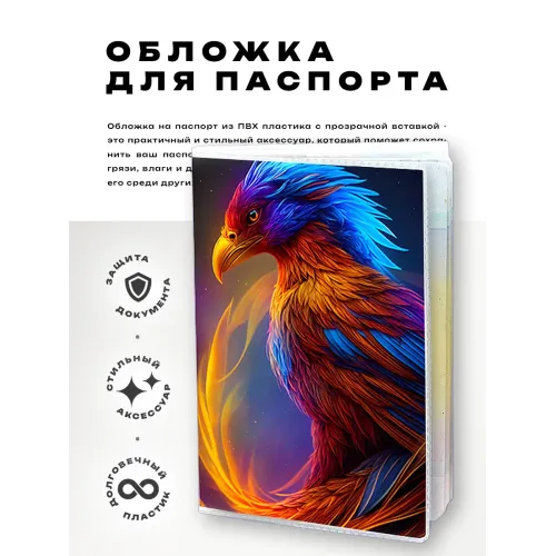 Обложка для паспорта из прозрачного ПВХ пластика с изображением орла — символа силы и свободы. Этот аксессуар не только защищает паспорт от повреждений, но и придаёт ему стильный вид. Упаковка выполнена в виде полипропиленового пакета с вырубкой под еврокрючок, что делает товар удобным для продажи и хранения. Обложка станет отличным подарком или полезным атрибутом для путешествий.