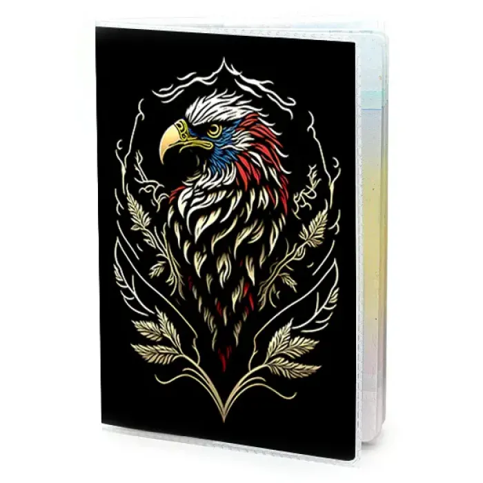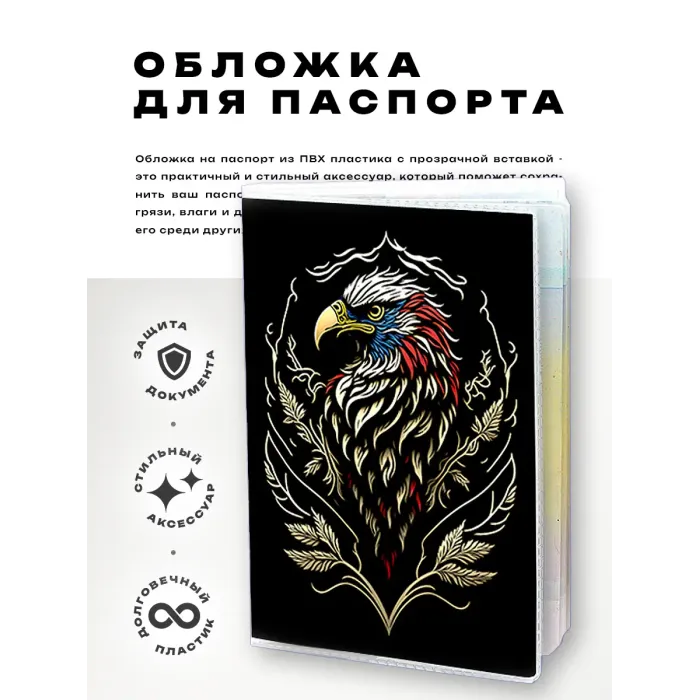 Обложка для паспорта выполнена из прозрачного ПВХ пластика, что придаёт ей лёгкость и стильный вид. Полиграфическая вставка с изображением орла добавляет элемент уникальности и символизирует силу и независимость. Упаковка в полипропиленовый пакет с вырубкой под еврокрючок позволяет удобно хранить и демонстрировать товар. Эта обложка станет отличным подарком или сувениром, отражающим культурные традиции.