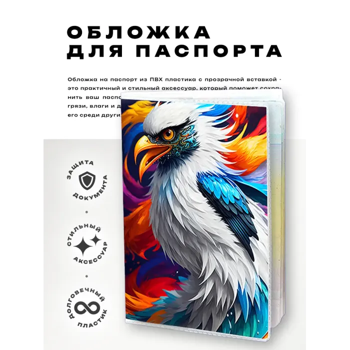 Эта обложка для паспорта, выполненная из прозрачного ПВХ пластика, станет стильным и практичным аксессуаром. Полиграфическая вставка с изображением птицы добавляет индивидуальности и яркости. Обложка защищает паспорт от повреждений и загрязнений, сохраняя его в идеальном состоянии. Упакована в удобный полипропиленовый пакет с вырубкой под еврокрючок, что делает её отличным вариантом для подарка или личного использования.