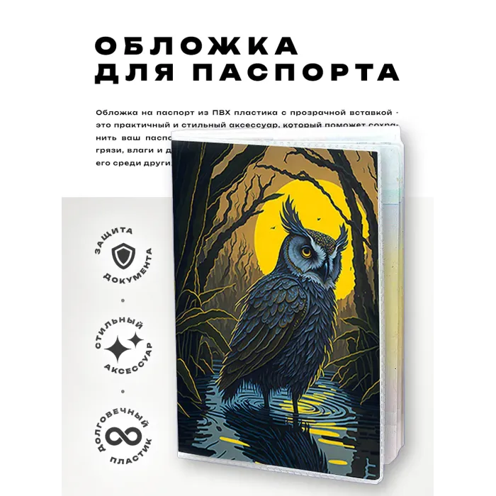 Обложка для паспорта из прозрачного ПВХ пластика с яркой полиграфической вставкой в виде совы. Этот стильный аксессуар не только защищает паспорт от повреждений, но и добавляет индивидуальности. Упакована в удобный полипропиленовый пакет с вырубкой под еврокрючок, что делает её идеальным вариантом для подарка или личного использования. Обложка станет отличным спутником в путешествиях и повседневной жизни, а также подчеркнёт любовь к оригинальному дизайну.
