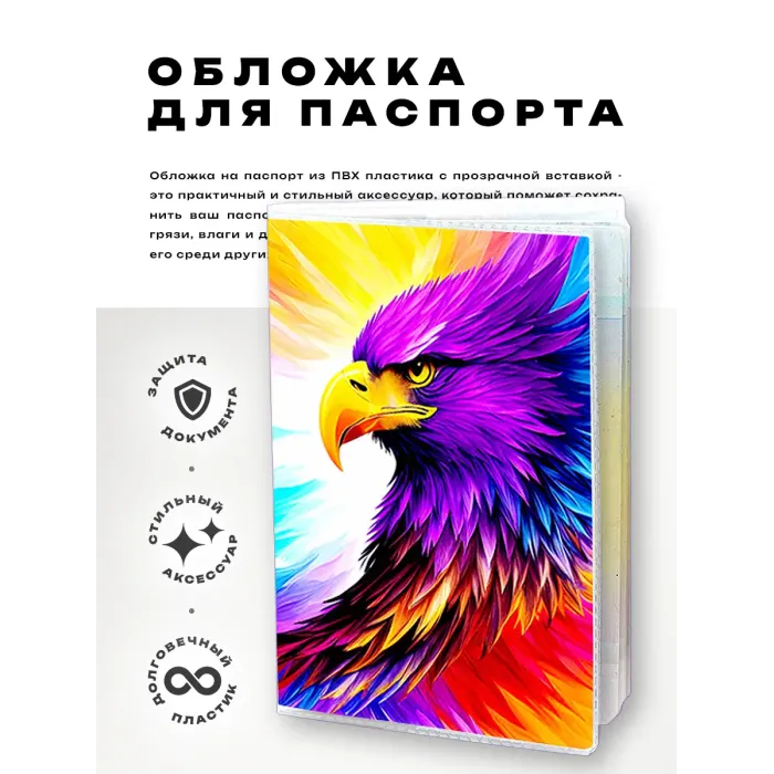 Обложка для паспорта из прозрачного ПВХ пластика — идеальное решение для защиты важных документов. Этот аксессуар не только практичен, но и украшен полиграфической вставкой с изображением орла, символизирующего силу и свободу. Обложка упакована в удобный полипропиленовый пакет с вырубкой под еврокрючок, что делает её отличным вариантом как для личного использования, так и в качестве подарка. Прекрасно подходит для хранения паспорта в идеальном состоянии на протяжении долгого времени.
