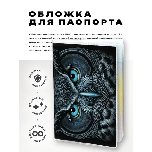Обложка для паспорта из прозрачного ПВХ пластика — это стильный и практичный аксессуар, который не только защищает документ от повреждений, но и добавляет индивидуальности. Полиграфическая вставка с изображением совы придаёт изделию оригинальный вид, отражая любовь к природе и символ мудрости. Обложка упакована в полипропиленовый пакет с вырубкой под еврокрючок, что делает её удобной для хранения и продажи. Этот аксессуар станет отличным подарком или сувениром для путешественников и ценителей уникальных вещей.