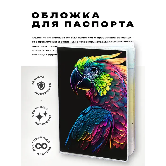 Обложка для паспорта из прозрачного ПВХ пластика сочетает в себе стиль и функциональность. Этот аксессуар не только защищает паспорт от повреждений, но и добавляет яркий акцент благодаря полиграфической вставке с изображением попугая. Упаковка выполнена в удобном формате — полипропиленовый пакет с вырубкой под еврокрючок, что делает товар идеальным вариантом как для личного использования, так и в качестве подарка. Обложка станет замечательным спутником в путешествиях и повседневной жизни.