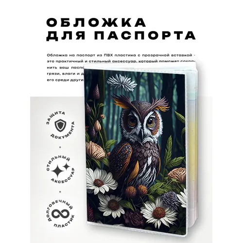 Эта обложка для паспорта выполнена из прозрачного ПВХ пластика, что обеспечивает надежную защиту документа от повреждений и загрязнений. Яркая полиграфическая вставка с изображением совы и ромашек добавляет индивидуальности и стиля. Упаковка в полипропиленовый пакет с вырубкой под еврокрючок делает товар удобным для хранения и продажи. Обложка станет отличным подарком или аксессуаром для путешествий, символизируя заботу о важнейших документах.