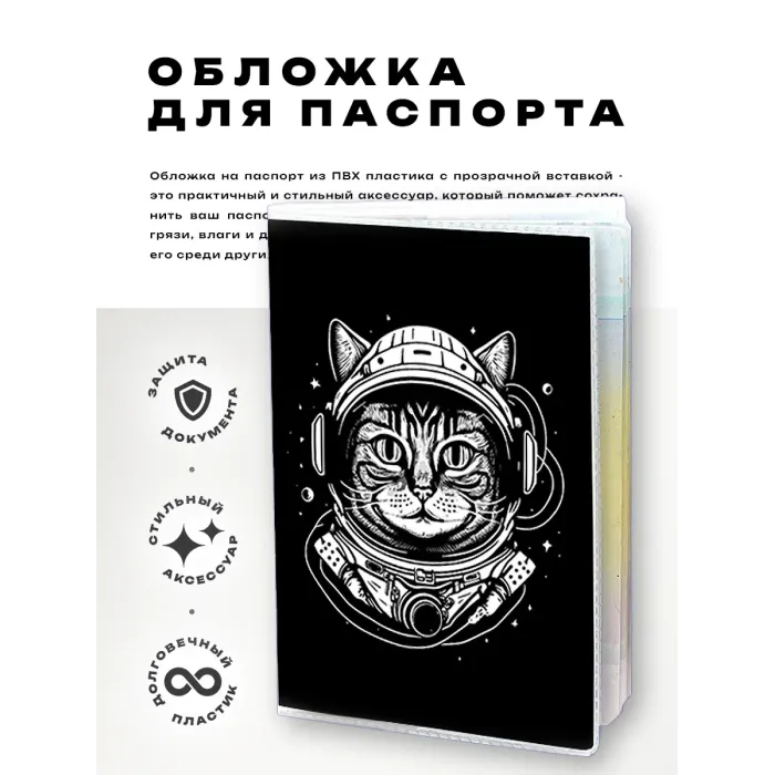 Обложка для паспорта, выполненная из прозрачного ПВХ пластика, станет стильным аксессуаром для путешествий. Она украшена яркой полиграфической вставкой с изображением кота-космонавта, что добавляет оригинальности и подчеркивает индивидуальность владельца. Упаковка в полипропиленовый пакет с вырубкой под еврокрючок делает её удобной для хранения и презентации. Такой аксессуар не только защитит паспорт от повреждений, но и станет отличным подарком для любителей космоса и животных.