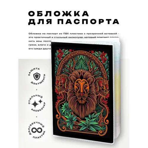 Обложка для паспорта из прозрачного ПВХ пластика с яркой полиграфической вставкой, изображающей льва. Этот аксессуар не только защищает паспорт от повреждений, но и добавляет индивидуальности владельцу. Упакована в удобный полипропиленовый пакет с вырубкой под еврокрючок, что делает её идеальным вариантом для подарка или личного использования. Обложка станет стильным дополнением к любому образу и подчеркнёт уникальность стиля.