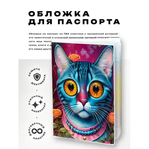 Обложка для паспорта из прозрачного ПВХ пластика с изображением кошки — стильный и практичный аксессуар, который не только защищает паспорт от повреждений, но и добавляет индивидуальности. Упакована в удобный полипропиленовый пакет с вырубкой под еврокрючок, что делает её идеальным вариантом для подарка или личного использования. Прозрачный материал позволяет легко видеть содержимое, а яркая полиграфическая вставка привлекает внимание и подчеркивает уникальность стиля. Обложка станет отличным спутником в путешествиях и повседневной жизни.