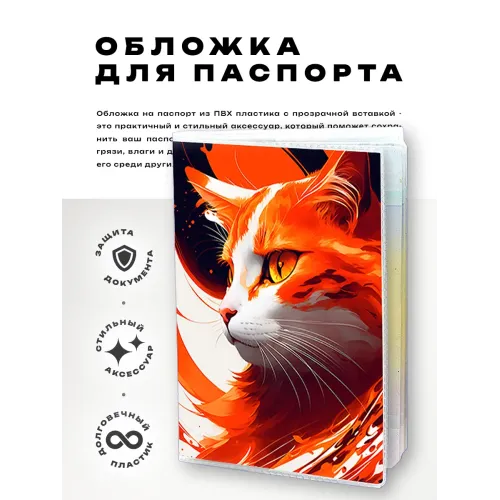 Обложка для паспорта выполнена из прозрачного ПВХ пластика, что обеспечивает надежную защиту документа и позволяет видеть его без необходимости извлечения. Полиграфическая вставка с изображением кота добавляет яркий акцент и индивидуальность. Упаковка в полипропиленовый пакет с вырубкой под еврокрючок делает товар удобным для хранения и продажи. Этот аксессуар станет отличным подарком или практичным дополнением к личным вещам, отражая любовь к животным.