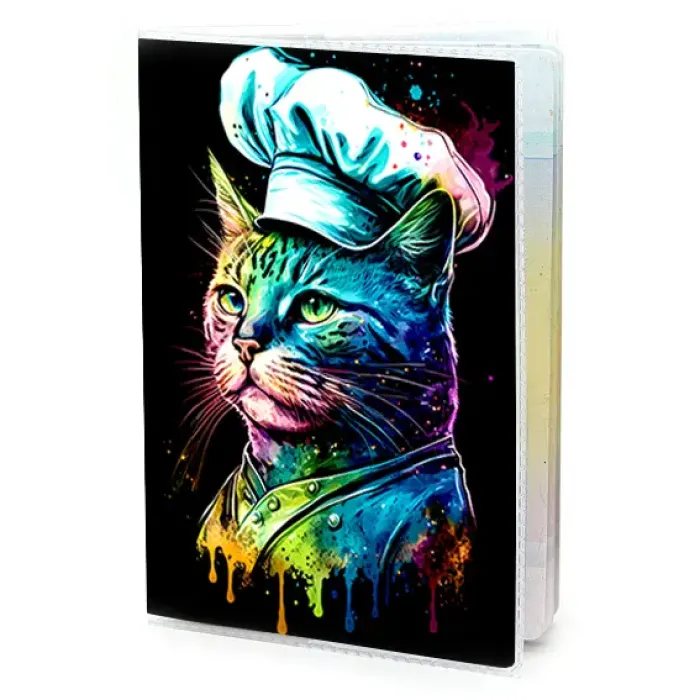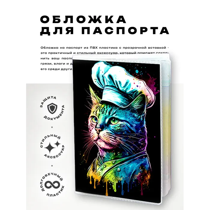 Обложка для паспорта из прозрачного ПВХ пластика — это не только практичный аксессуар, но и оригинальный сувенир. Симпатичный дизайн с изображением кота-повара добавляет нотку игривости и индивидуальности. Обложка защищает паспорт от повреждений, сохраняя его в идеальном состоянии.