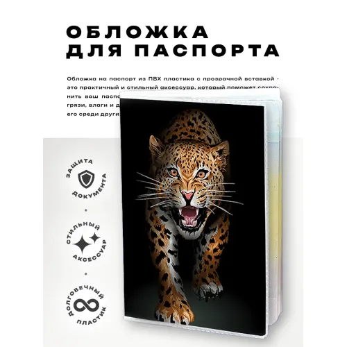 Эта стильная обложка для паспорта выполнена из прозрачного ПВХ пластика и украшена яркой полиграфической вставкой с леопардовым принтом. Она не только защищает паспорт от повреждений, но и придаёт ему уникальный вид. Упаковка в полипропиленовый пакет с вырубкой под еврокрючок делает её удобной для хранения и транспортировки. Обложка станет отличным аксессуаром для путешествий или подарком любителям стиля и оригинальности.