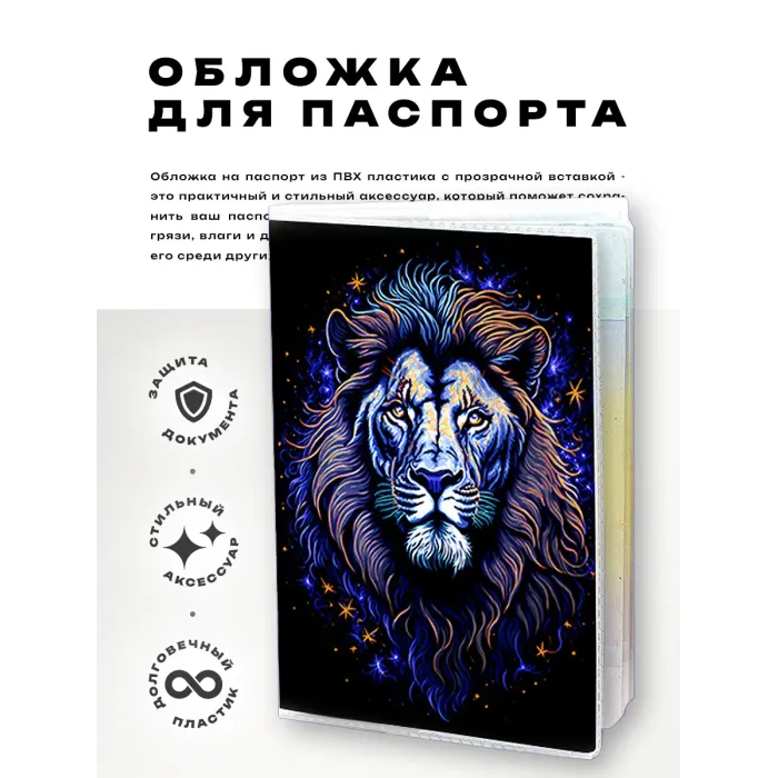 Обложка для паспорта из прозрачного ПВХ пластика — это не только практичный аксессуар, но и стильный элемент, который подчеркнёт индивидуальность. Она украшена яркой полиграфической вставкой с изображением льва, символизирующего силу и уверенность. Обложка защищает паспорт от повреждений и загрязнений, обеспечивая его долговечность.