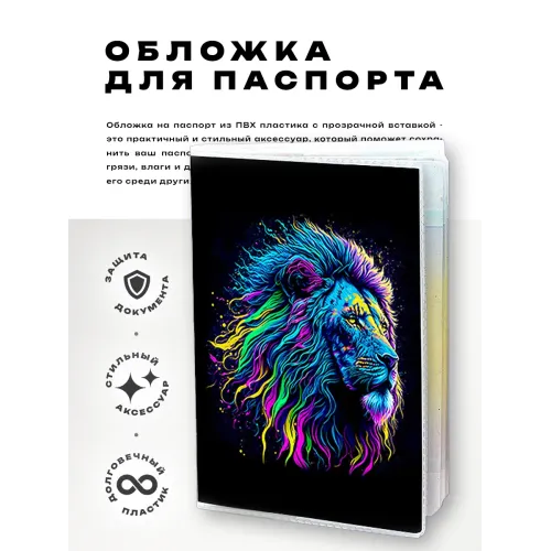 Обложка для паспорта из прозрачного ПВХ пластика с яркой полиграфической вставкой, изображающей льва. Этот стильный аксессуар не только защищает паспорт от повреждений, но и добавляет индивидуальности владельцу. Упаковка выполнена в виде полипропиленового пакета с вырубкой под еврокрючок, что делает её удобной для хранения и транспортировки. Обложка станет отличным подарком или сувениром, отражающим силу и благородство этого удивительного животного.