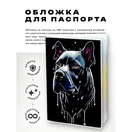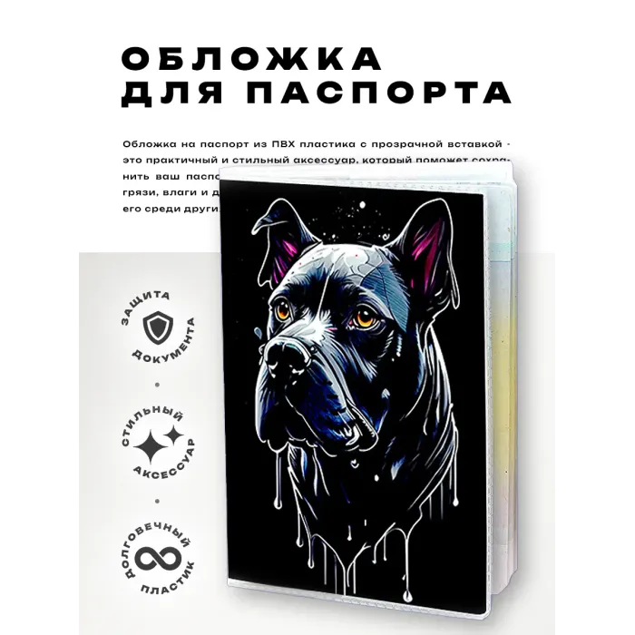 Обложка для паспорта из прозрачного ПВХ пластика — это стильный и практичный аксессуар, который защитит важный документ от повреждений. Полиграфическая вставка с изображением пса придаёт изделию уникальность и характер. Упаковка в полипропиленовый пакет с вырубкой под еврокрючок делает продукт удобным для хранения и продажи. Такой аксессуар станет отличным подарком или сувениром, отражающим любовь к домашним животным.