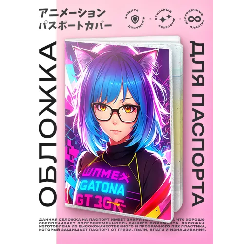 Обложка для паспорта — это стильный и практичный аксессуар, который станет отличным дополнением к любому образу. Изготовленная из прозрачного ПВХ пластика, она защищает паспорт от повреждений и загрязнений, придавая ему оригинальный вид благодаря яркой полиграфической вставке с изображением аниме девушки неко в очках.