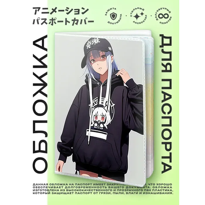 Обложка для паспорта, выполненная из прозрачного ПВХ пластика, станет стильным аксессуаром и защитит документ от повреждений. Полиграфическая вставка с изображением аниме девушки в худи добавляет оригинальности и индивидуальности. Упаковка в полипропиленовый пакет с вырубкой под еврокрючок позволяет удобно разместить товар на витрине или подарить его. Эта обложка не только практична, но и отражает увлечение культурой аниме, что делает её отличным подарком для поклонников жанра.