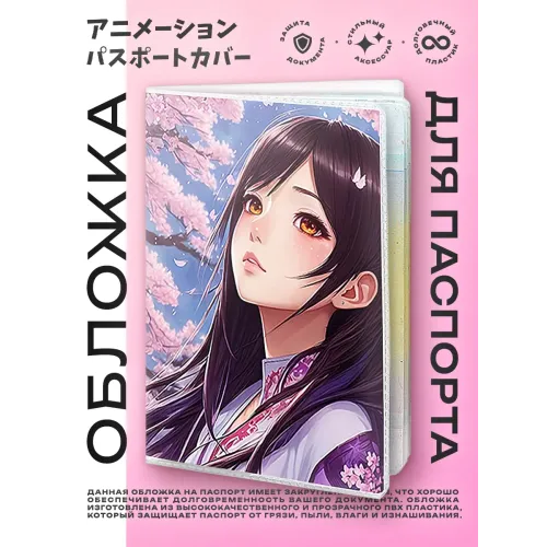Обложка для паспорта выполнена из прозрачного ПВХ пластика, что обеспечивает долговечность и защиту документа. Яркая полиграфическая вставка с изображением девушки на фоне сакуры добавляет эстетическую привлекательность. Упакована в удобный полипропиленовый пакет с вырубкой под еврокрючок, что позволяет легко разместить товар на витрине или в магазине. Эта обложка станет не только практичным аксессуаром, но и стильным элементом для любителей аниме и японской культуры.