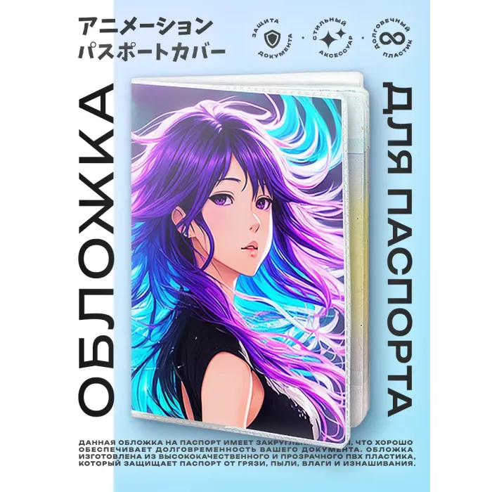 Обложка для паспорта выполнена из прозрачного ПВХ пластика и украшена яркой полиграфической вставкой с изображением аниме девушки. Этот стильный аксессуар не только защитит паспорт от повреждений, но и добавит индивидуальности. Упакована в удобный полипропиленовый пакет с вырубкой под еврокрючок, что делает её идеальным вариантом для подарка или личного использования. Обложка станет отличным спутником в путешествиях и повседневной жизни, отражая увлечение миром аниме.