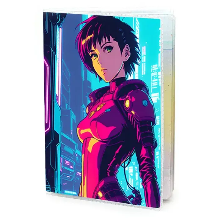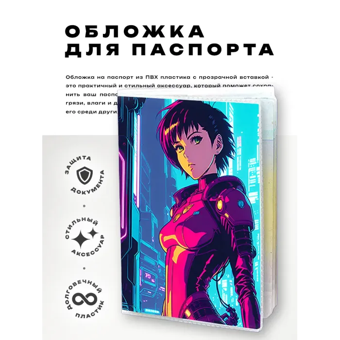 Обложка для паспорта в стиле аниме киберпанк — это не только практичный аксессуар, но и стильное выражение индивидуальности. Изготовленная из прозрачного ПВХ пластика, она обеспечивает надежную защиту документа от повреждений и загрязнений.