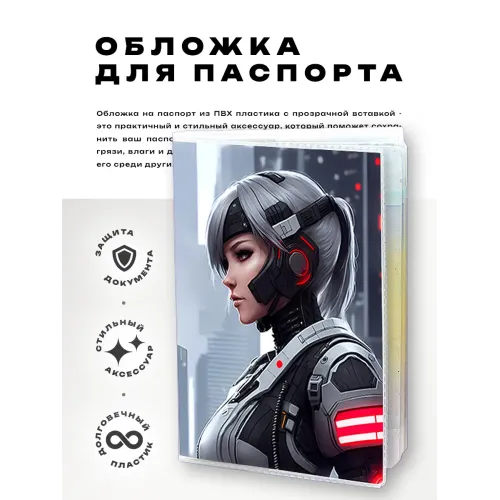 Обложка для паспорта в стиле киберпанк — это не только практичный аксессуар, но и яркое выражение индивидуальности. Изготовленная из прозрачного ПВХ пластика, она защищает паспорт от повреждений и придаёт ему стильный вид. Полиграфическая вставка с уникальным дизайном добавляет оригинальности, а упаковка в полипропиленовый пакет с вырубкой под еврокрючок делает её удобной для хранения или подарка. Эта обложка станет отличным спутником в путешествиях и повседневной жизни.