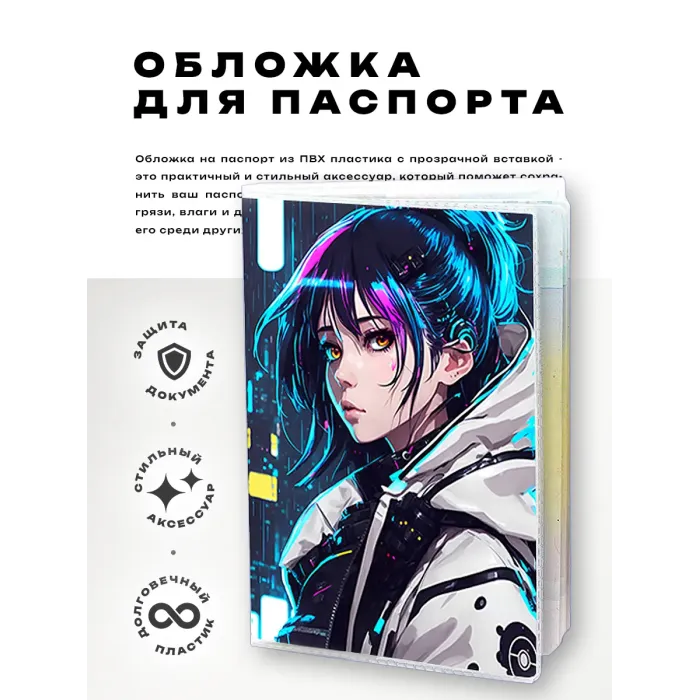 Обложка для паспорта в стиле киберпанк — это не только практичный аксессуар, но и яркое выражение индивидуальности. Изготовленная из прозрачного ПВХ пластика, она защищает паспорт от повреждений и загрязнений, сохраняя его в идеальном состоянии.