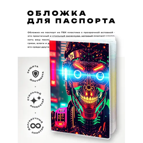 Эта обложка для паспорта в стиле киберпанк станет не только стильным аксессуаром, но и защитит документ от повреждений. Изготовленная из прозрачного ПВХ пластика, она позволяет видеть паспорт и при этом предохраняет его от загрязнений и износа. Полиграфическая вставка с изображением робота добавляет оригинальности и подчеркивает индивидуальность владельца. Упаковка выполнена в виде полипропиленового пакета с вырубкой под еврокрючок, что делает её удобной для хранения или подарка. Обложка идеально подходит для путешествий и повседневного использования.