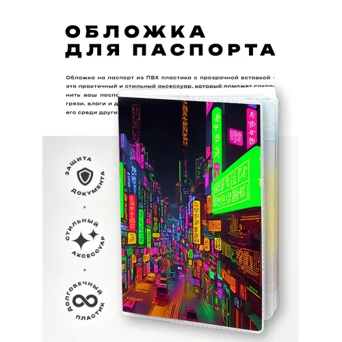 Обложка для паспорта в стиле киберпанк — это яркий аксессуар, который добавит индивидуальности и стиля. Изготовленная из прозрачного ПВХ пластика, она защищает документ от повреждений и загрязнений. Полиграфическая вставка с эффектом неона создает уникальный визуальный эффект, отражая дух современных технологий и городской культуры. Упаковка в полипропиленовый пакет с вырубкой под еврокрючок делает товар удобным для хранения и продажи. Этот аксессуар станет отличным подарком или стильным дополнением к любому образу.