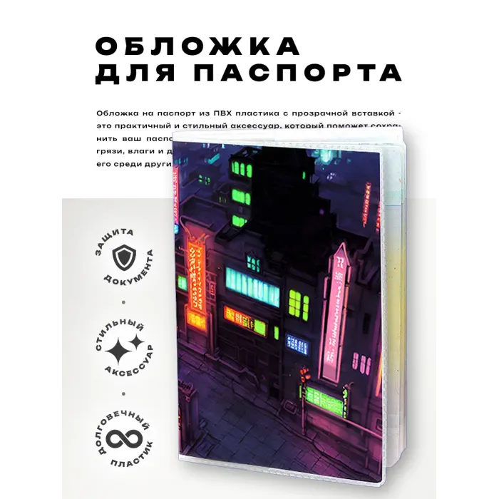 Обложка для паспорта в стиле киберпанк — это идеальное сочетание стиля и практичности. Изготовленная из прозрачного ПВХ пластика, она защищает паспорт от повреждений и загрязнений, а яркая полиграфическая вставка добавляет уникальности. Упаковка в полипропиленовый пакет с вырубкой под еврокрючок делает этот товар удобным для хранения и продажи. Обложка станет отличным подарком или сувениром для любителей футуристического дизайна.