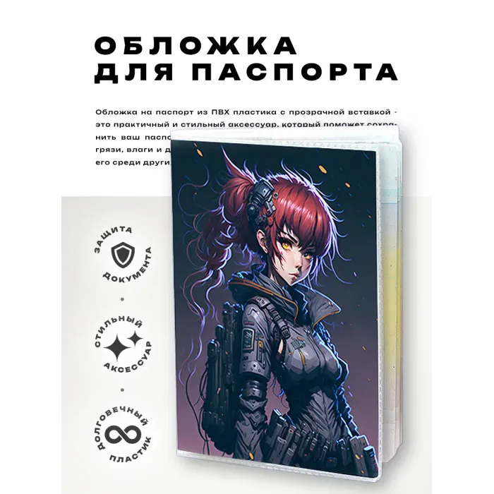 Обложка для паспорта в стиле киберпанк — это не только практичный аксессуар, но и яркое выражение индивидуальности. Изготовленная из прозрачного ПВХ пластика, она обеспечивает надежную защиту документа от повреждений и загрязнений. Полиграфическая вставка добавляет оригинальности и стиля, а упаковка в полипропиленовый пакет с вырубкой под еврокрючок делает её идеальным вариантом для подарка или продажи. Эта обложка станет отличным спутником в путешествиях и повседневной жизни, подчеркивая уникальный стиль владельца.