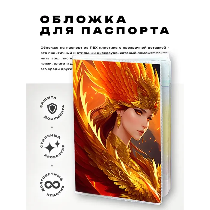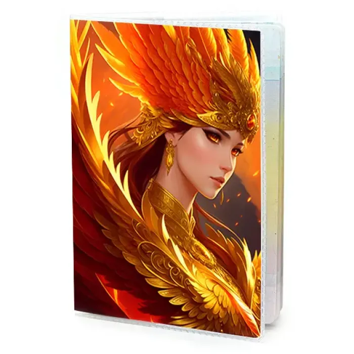 Обложка для паспорта из прозрачного ПВХ пластика с полиграфической вставкой с изображением девушки-феникса.