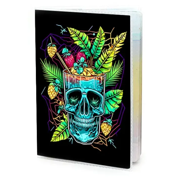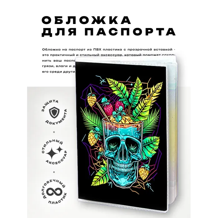 Обложка для паспорта из прозрачного ПВХ пластика с полиграфической вставкой изображения коктейля и черепа.