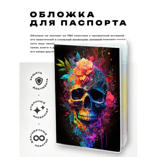 Обложка для паспорта, выполненная из прозрачного ПВХ пластика, станет стильным аксессуаром и защитит важный документ от повреждений. Яркая полиграфическая вставка с изображением черепа и цветов добавляет оригинальности и индивидуальности. Упаковка в полипропиленовый пакет с вырубкой под еврокрючок делает товар удобным для хранения и демонстрации. Эта обложка не только функциональна, но и отражает уникальный стиль своего владельца.