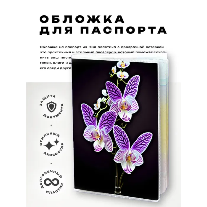 Эта обложка для паспорта из прозрачного ПВХ пластика станет стильным и практичным аксессуаром. Она украшена яркой полиграфической вставкой с цветочным дизайном, что придаёт ей уникальный вид. Обложка защищает паспорт от повреждений и загрязнений, обеспечивая долговечность использования.