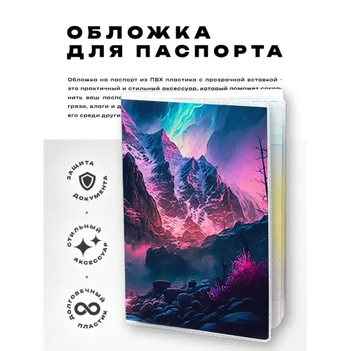 Обложка для паспорта из прозрачного ПВХ пластика — это стильный и практичный аксессуар, который не только защищает документ, но и добавляет индивидуальности. Полиграфическая вставка с изображением гор создает уникальный дизайн, отражая любовь к природе и путешествиям.
