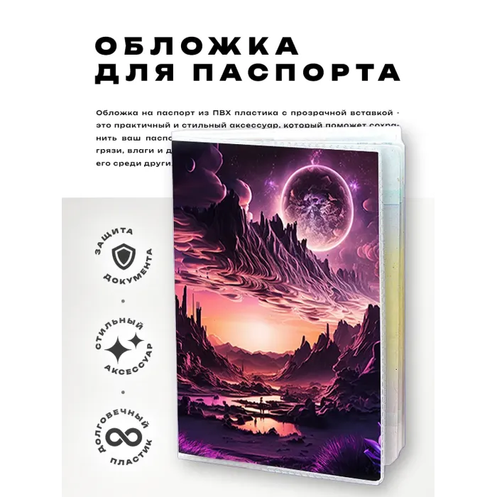 Эта обложка для паспорта выполнена из прозрачного ПВХ пластика и украшена яркой полиграфической вставкой с изображением гор. Она не только надежно защитит паспорт от повреждений, но и добавит индивидуальности в его оформление. Упаковка представляет собой удобный полипропиленовый пакет с вырубкой под еврокрючок, что делает ее отличным вариантом для подарка или личного использования. Обложка станет стильным аксессуаром для путешествий, позволяя легко находить паспорт в сумке или рюкзаке.