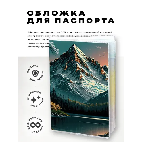 Эта обложка для паспорта из прозрачного ПВХ пластика не только защищает документ от повреждений, но и придаёт ему стильный вид. Полиграфическая вставка с изображением озера добавляет уникальности и эстетики. Упаковка в полипропиленовый пакет с вырубкой под еврокрючок делает её удобной для хранения и продажи. Обложка идеально подходит как для личного использования, так и в качестве подарка.
