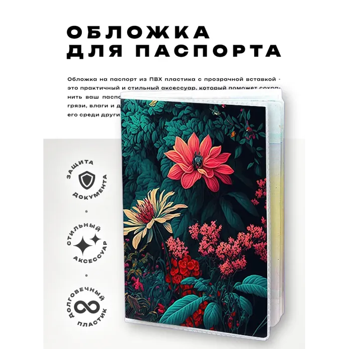 Эта обложка на паспорт выполнена из прозрачного ПВХ пластика и украшена яркой полиграфической вставкой с цветочным дизайном. Она не только защищает документ от повреждений, но и добавляет стильный акцент в повседневную жизнь. Упаковка в полипропиленовый пакет с вырубкой под еврокрючок делает её удобной для хранения и продажи. Обложка станет отличным подарком или практичным аксессуаром для путешествий.