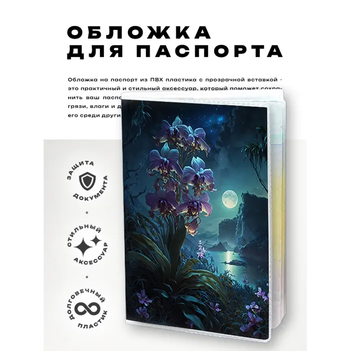 Эта обложка для паспорта из прозрачного ПВХ пластика не только защищает документ, но и придаёт ему стильный вид благодаря яркой полиграфической вставке с изображением орхидеи. Компактные размеры делают её удобной для ношения в сумке или кармане. Упаковка в полипропиленовый пакет с вырубкой под еврокрючок позволяет легко разместить товар на витрине. Обложка станет прекрасным подарком для любителей путешествий и ценителей красивых аксессуаров.